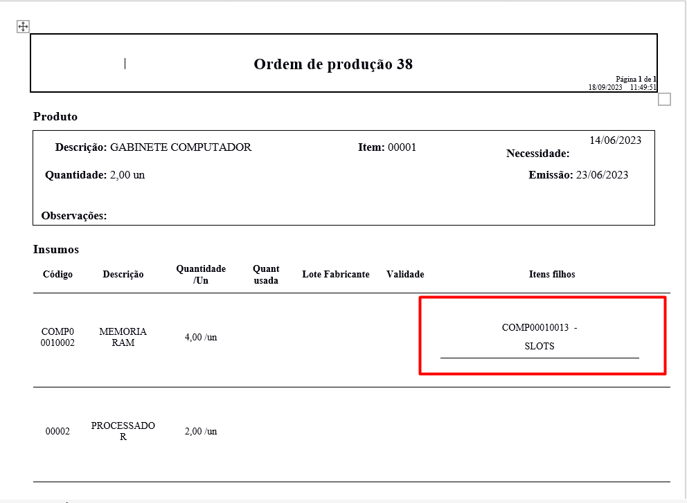 - Disponibilizado na tela de ordens de produção, um novo relatório nomeado “Impressão OP – com itens filhos dos insumos.xlsx”, para listar os insumos de um item-filho fabricado da ordem de produção. Para saber mais sobre relatórios personalizados, clique aqui.