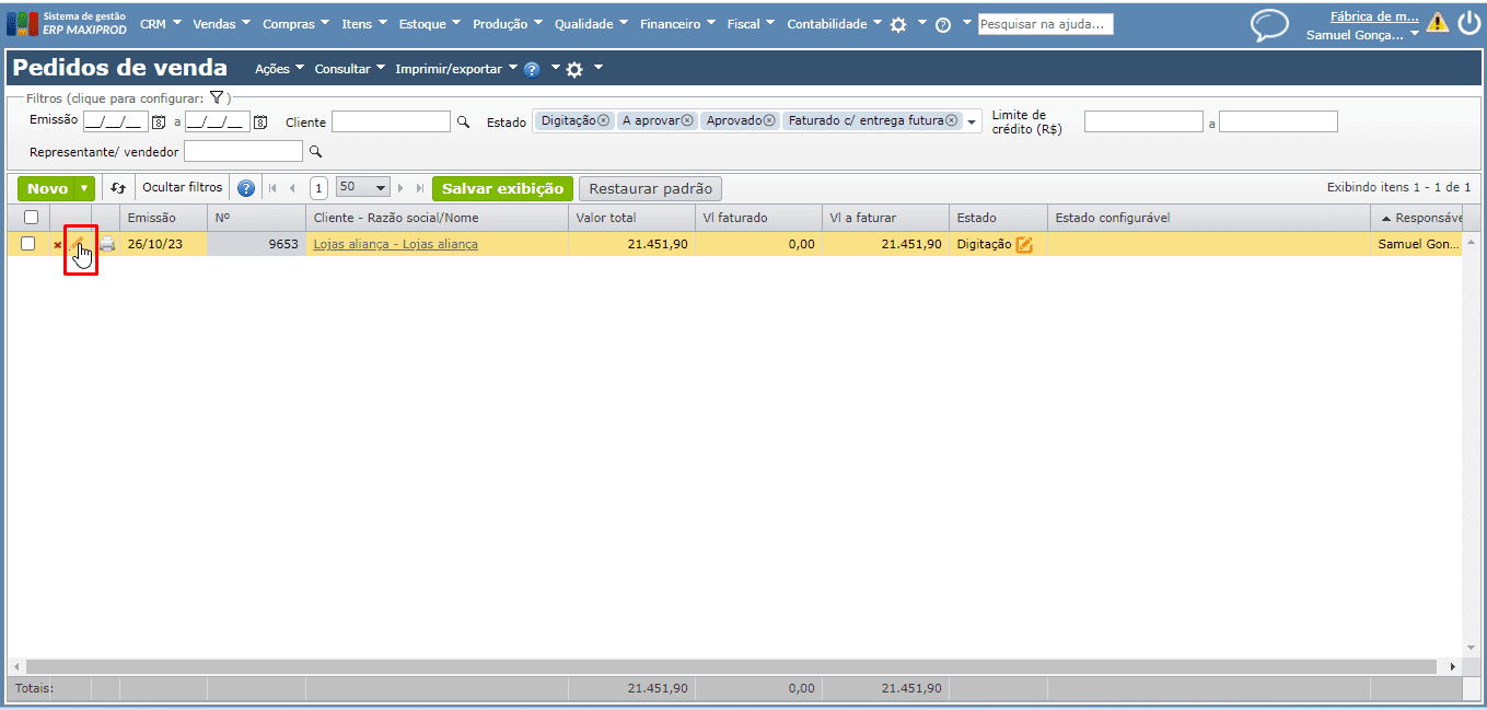 2) Localize o(s) pedido(s) de venda cujo(s) item(ns) está(ão) vinculado(s) ao(s) item(ns) da nota fiscal que deseja emitir. Ao localizar o(s) pedido(s), clique no ícone do lápis para editar, ou dê um duplo-clique sobre a linha do pedido.