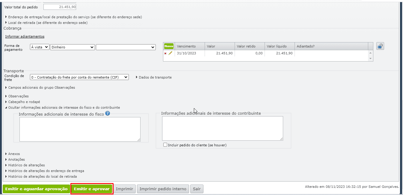 3) Navegue até o rodapé da tela de edição do pedido e clique no botão “Emitir e aprovar”, caso o pedido esteja em estado de “Digitação”. Ou clique no botão verde “Aprovar”, caso o pedido esteja no estado “A aprovar”. Se o seu usuário não tem permissão para aprovar pedidos de venda, solicite esta permissão ao usuário administrador da sua empresa ou peça para que outro usuário que tenha a permissão, faça a emissão e/ou aprovação.