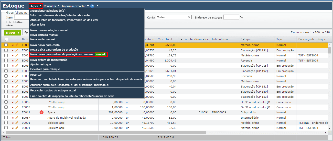 1) Acesse o menu “Produção > Ordens de produção”.  Na tela de Ordens de produção, vá ao menu “Ações > Baixar insumo para ordens de produção em massa”. Pode-se acessar também pelo menu “Estoque > Estoque, e na página de Estoque, clicar em “Ações > Nova baixa para ordens de produção em massa”.