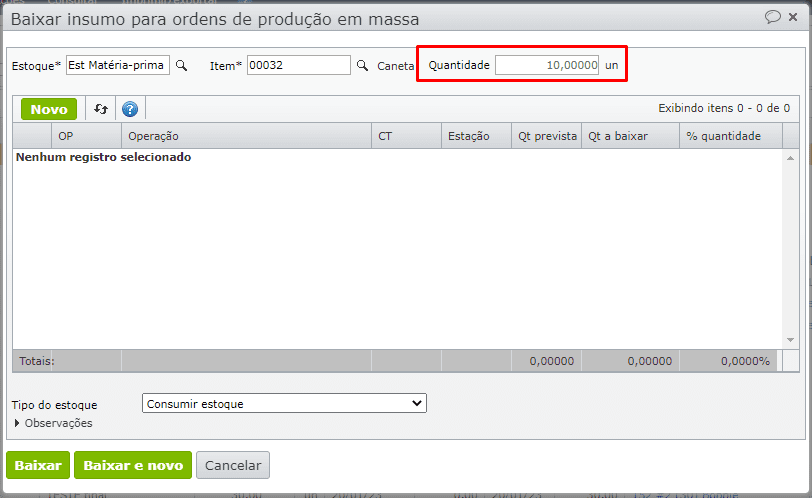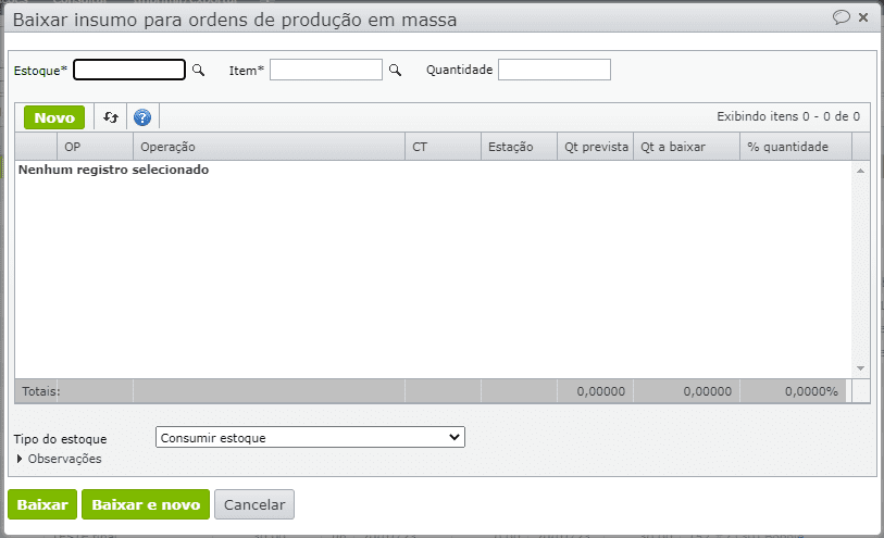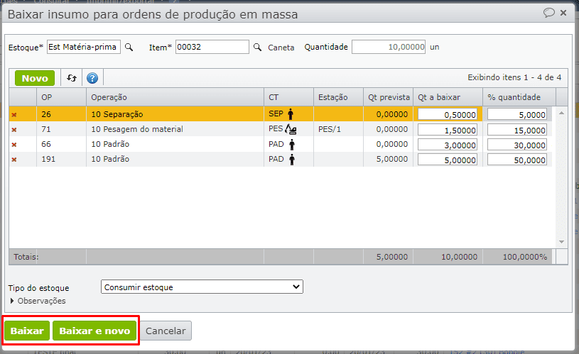 6) Após o preenchimento das quantidades a baixar, clique em “Baixar” ou “Baixar e novo” para efetivar a baixa do insumo para as ordens de produção listadas: