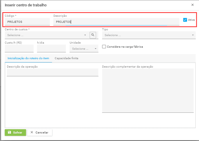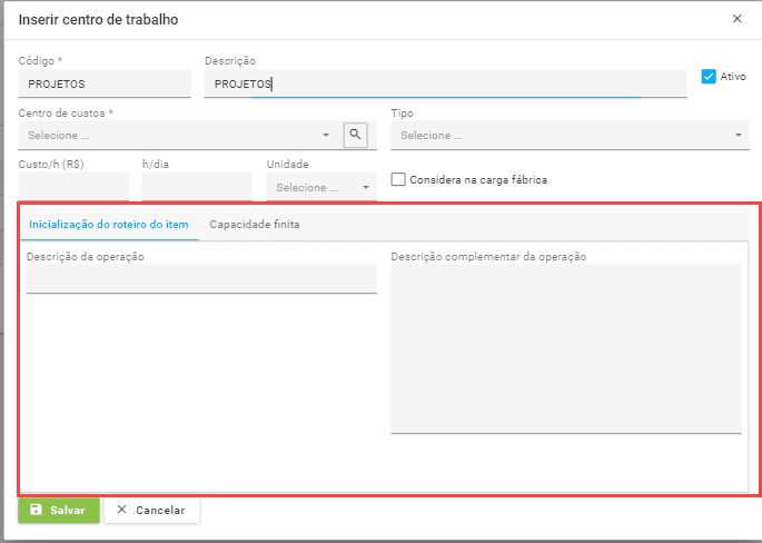 - Descrição da operação: inicializa a descrição das operações que utilizam este CT. Por exemplo, se todas as operações que passam pelo CT CORTE devem ter a descrição “corte de madeira”, isto é informado neste campo.