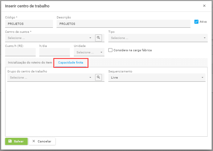 5) As propriedades da aba de planejamento com capacidade finita devem ser preenchidas se esta funcionalidade for usada.
