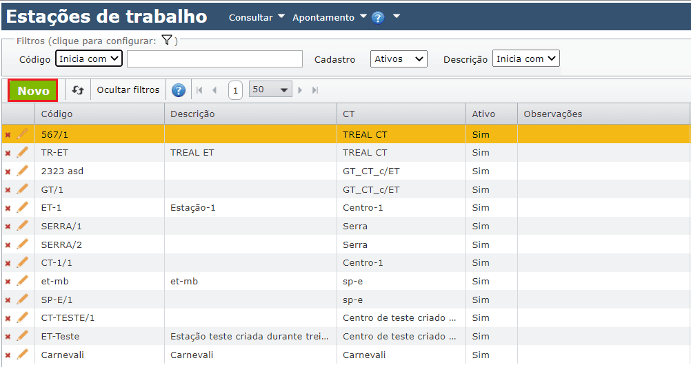- Código: do CT. Campo obrigatório, que não pode ser preenchido com letras minúsculas.