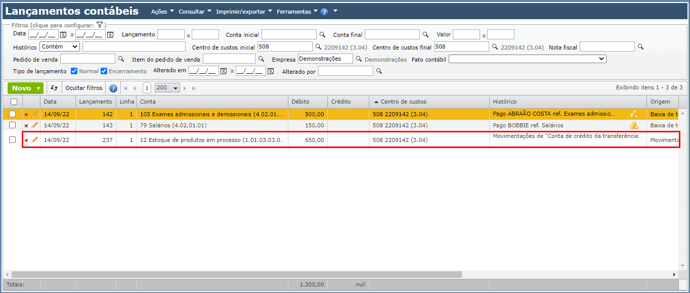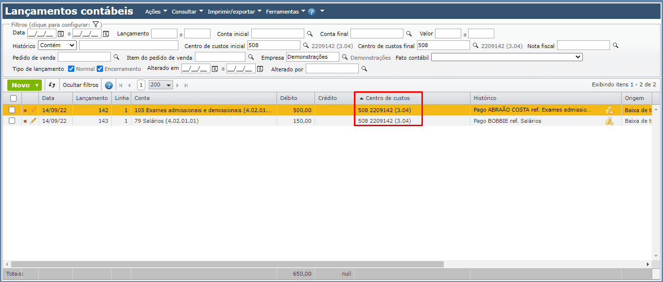 Lançamentos contábeis vinculados ao centro de custos do centro de trabalho