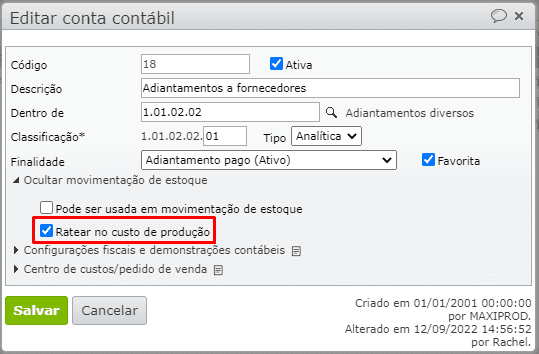 Atenção: para que o custo dos lançamentos contábeis seja calculado e atribuído ao estoque resultante da OP, é necessário marcar a opção “” em todas as contas contábeis utilizadas nos lançamentos.