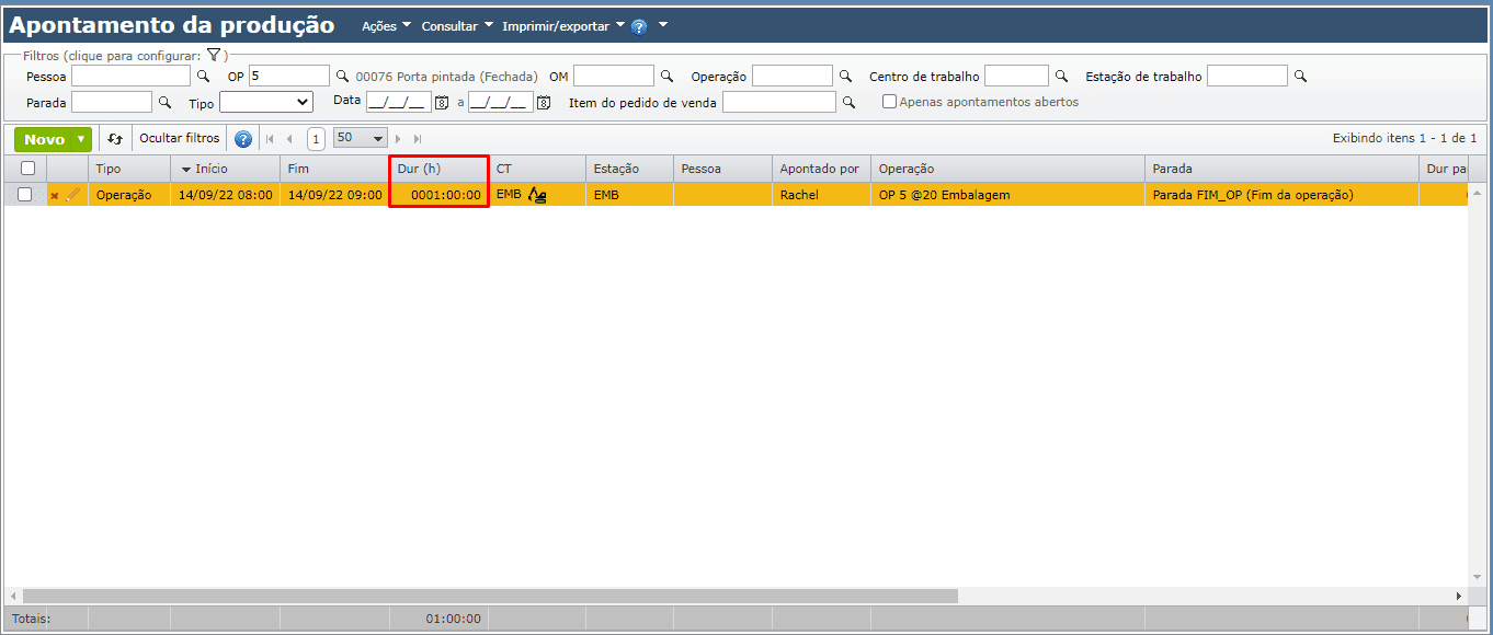 Neste exemplo, foi criado um apontamento de operação de 1h para a operação vinculada à OP cuja mão de obra desejamos calcular: