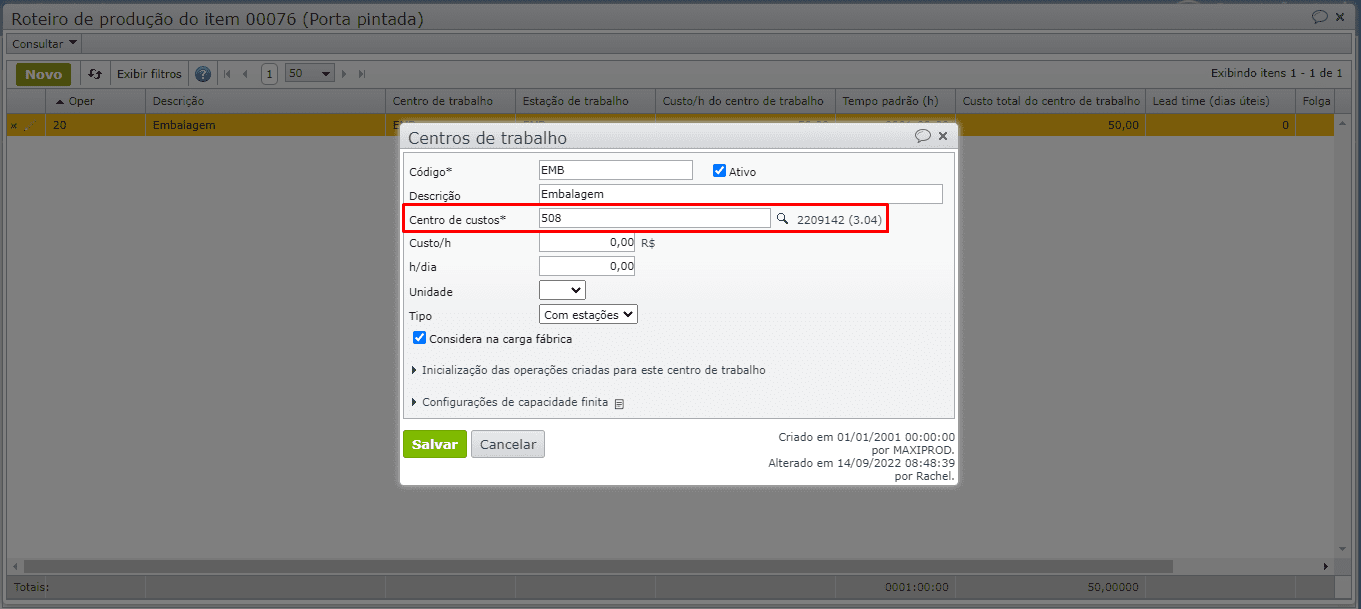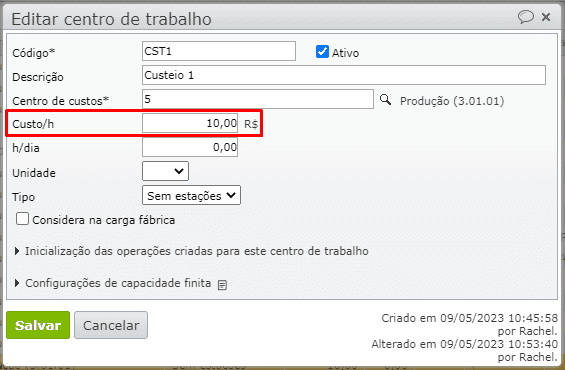 Mas antes , é necessário cadastrar  o custo/h de cada centro de trabalho (CT).