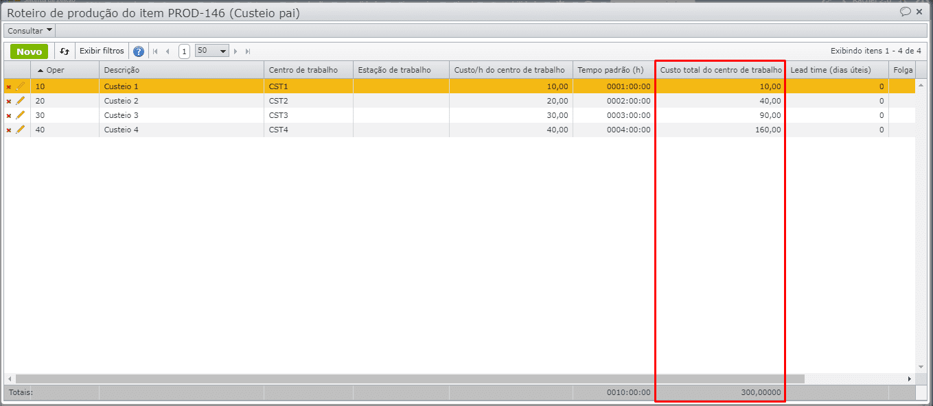 4. Após o recálculo, o custo final total da mão de obra, atribuído ao estoque, corresponderá ao custo das operações do roteiro do item: