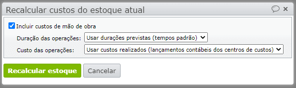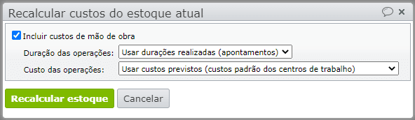 Este cálculo inclui do custo de mão de obra utilizando as opções “Usar durações previstas (tempos padrão)” e “Usar custos previstos (custos padrão dos centros de trabalho)” no recálculo dos custos do estoque atual ou no fechamento do estoque: