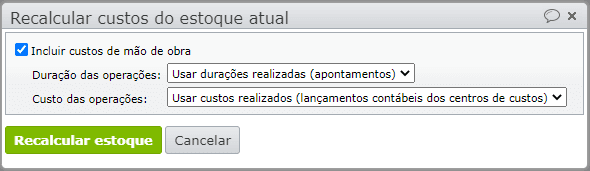 Este cálculo inclui os custos de mão de obra utilizando as opções “Usar durações realizadas (apontamentos)” e “Usar custos realizados (lançamentos contábeis dos centros de custos)” no recálculo dos custos do estoque atual ou no fechamento do estoque: