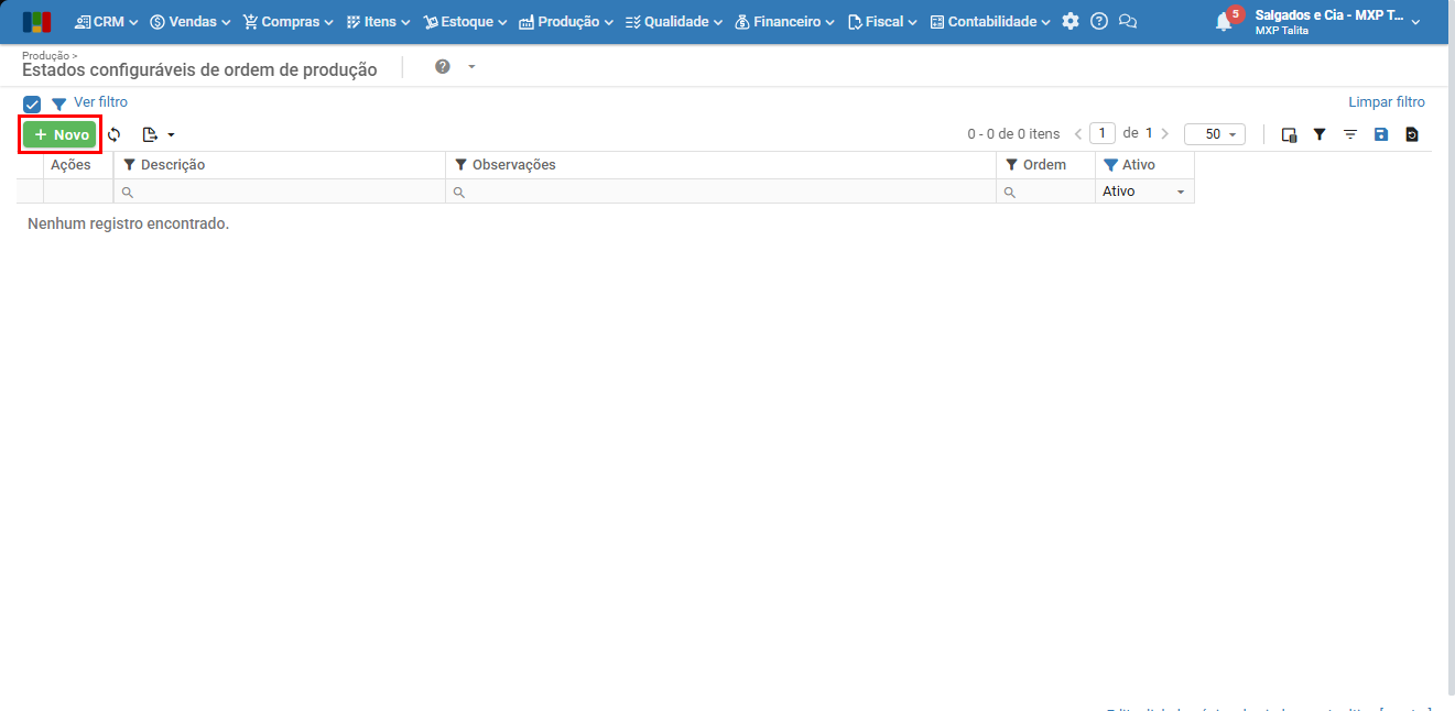 2) Na tela de estados de ordem de produção, clique no botão verde “Novo”.