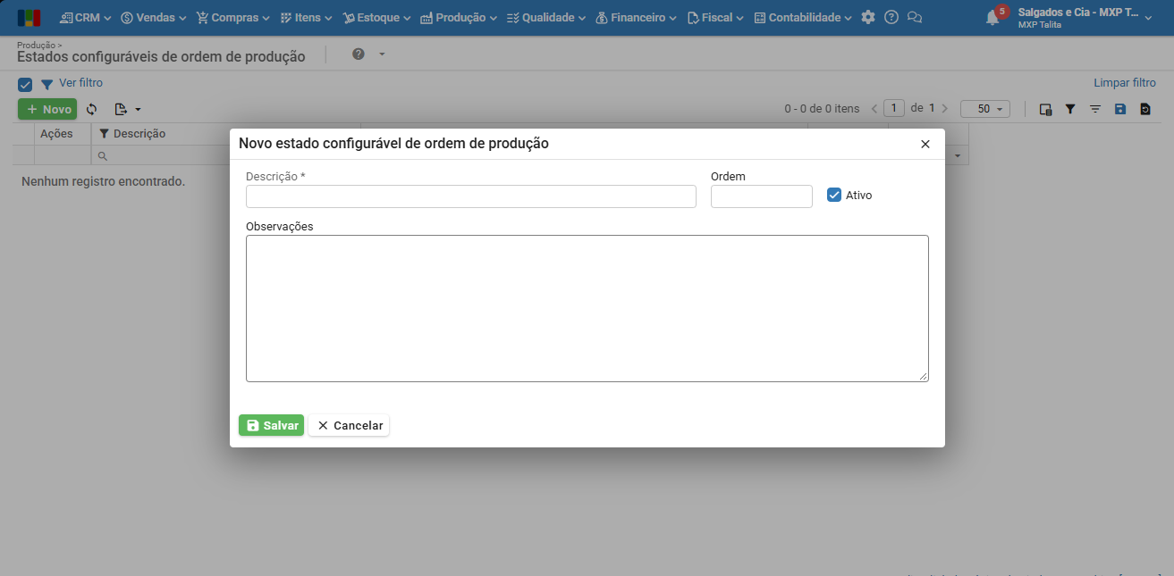 No ERP MAXIPROD, é possível criar estados configuráveis para acompanhar cada etapa do processo produtivo. Esses estados permitem adaptar o fluxo de trabalho às necessidades específicas da empresa, oferecendo mais controle e visibilidade sobre o andamento das ordens de produção.