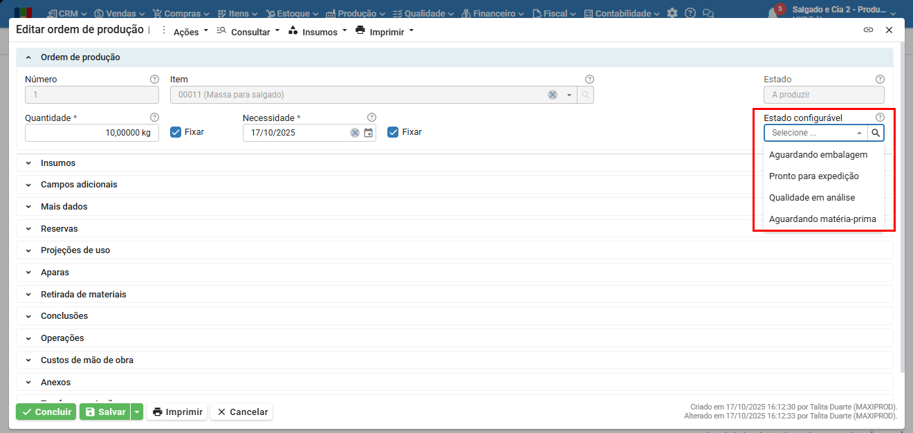 Por meio dos estados configuráveis, o usuário pode criar estados personalizados para as fases da produção, além dos estados padrão do sistema, como “A produzir” ou “Cancelada”.