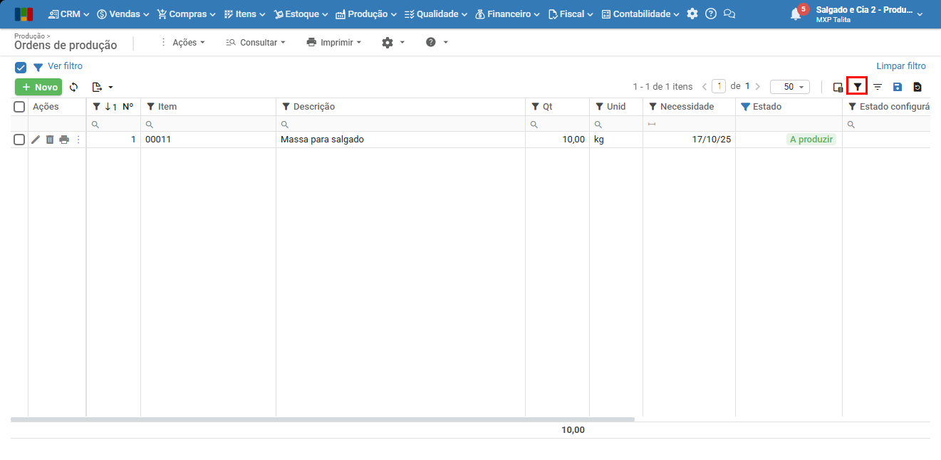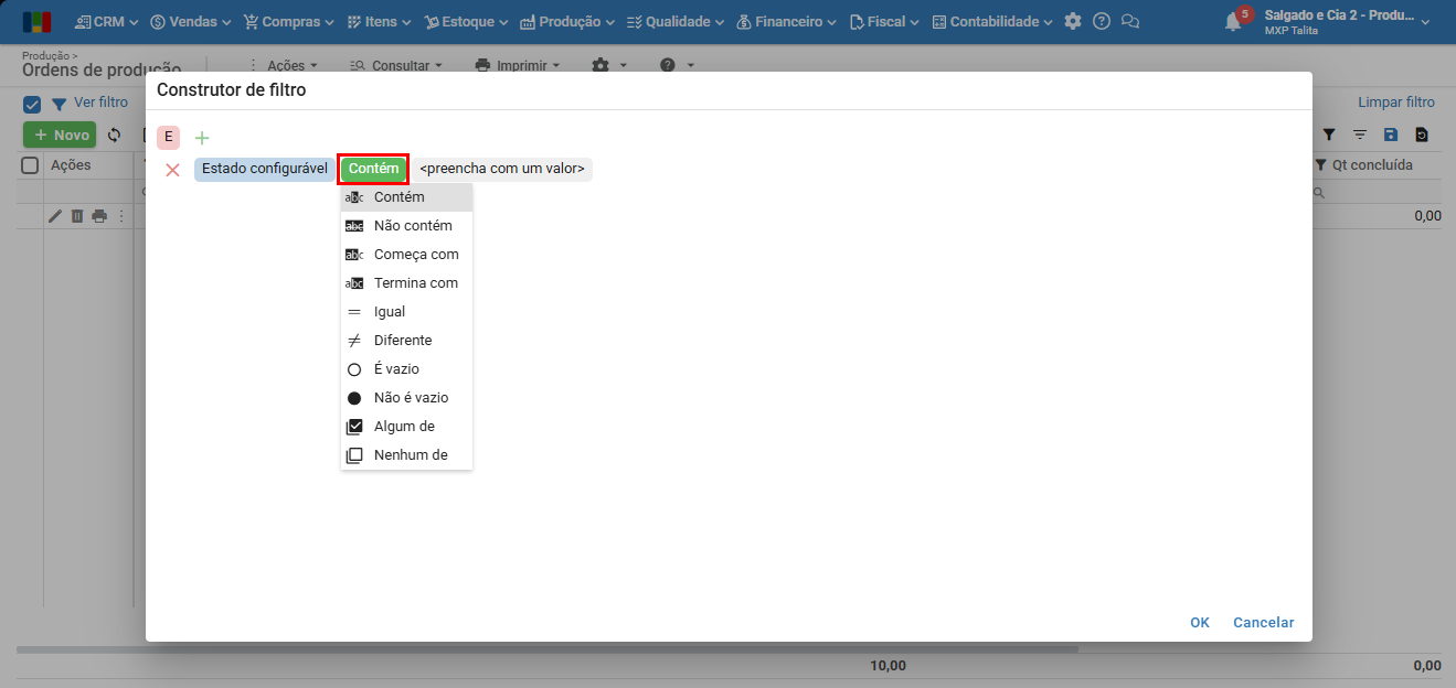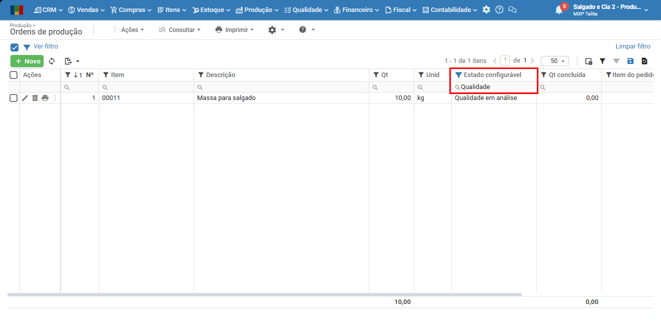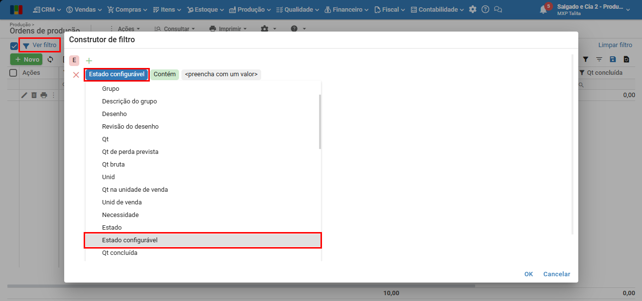 Exemplo: Conforme a imagem, o filtro irá buscar as ordens de produção cujo estado configurável contenha o texto “Qualidade”.