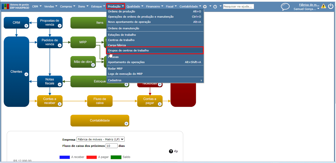 1) Acesse o menu superior “Produção” > opção “Grupos de centros de trabalho”.