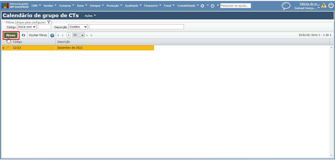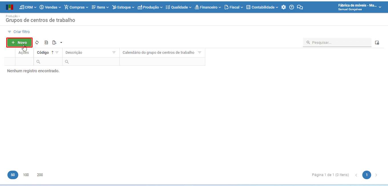 2) É aberta uma nova guia no navegador com a grade de “Grupos de centros de trabalho”. Clique no botão verde “Novo” para cadastrar um novo grupo de centros de trabalho.