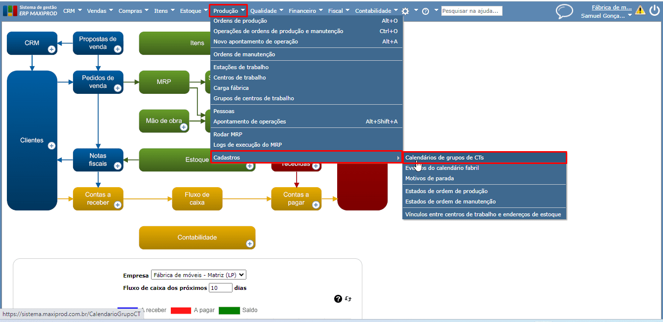 1) Acesse o menu superior “Produção > Cadastros > Calendários de grupos de CTs”.