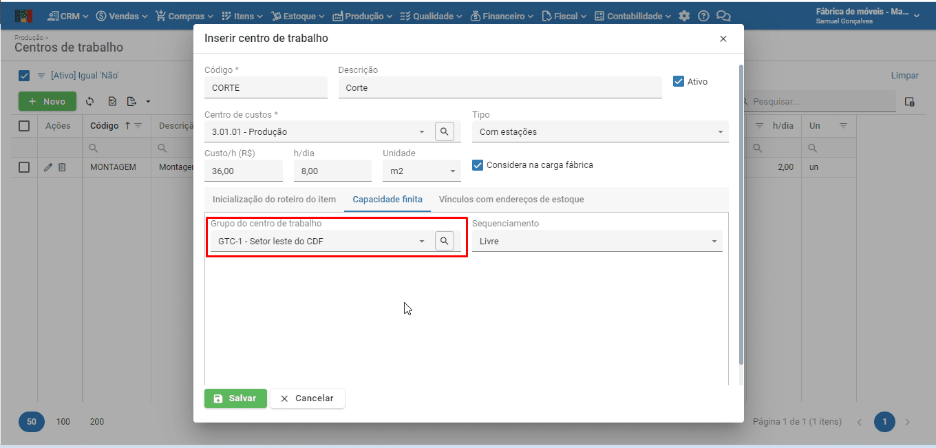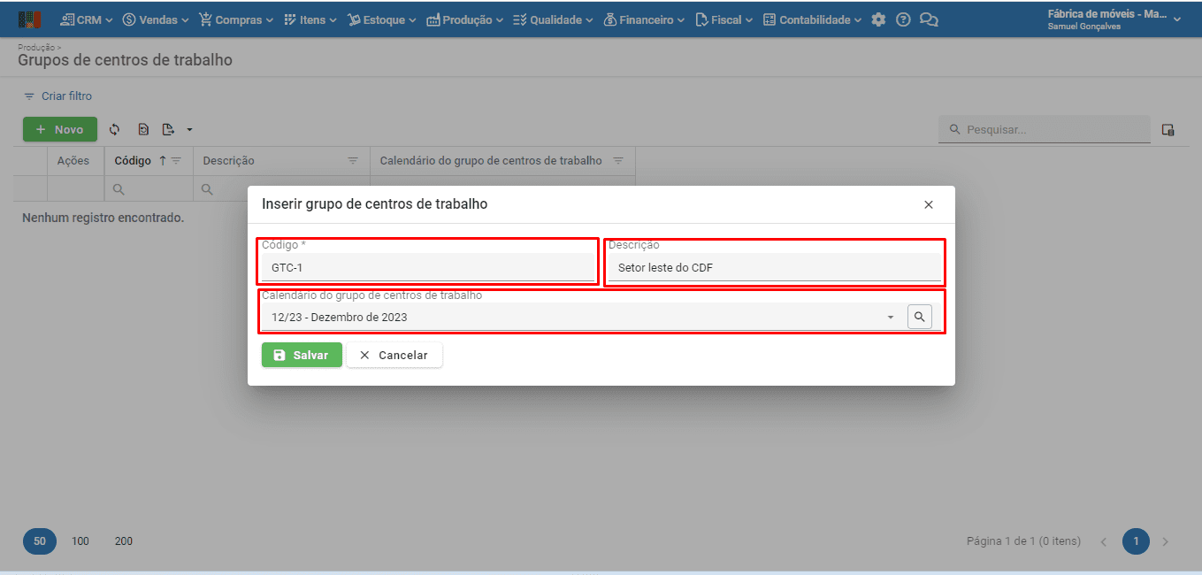4) Preencha o campo “Grupo do centro de trabalho” com uma opção previamente cadastrada, conforme mostrado no primeiro tópico.