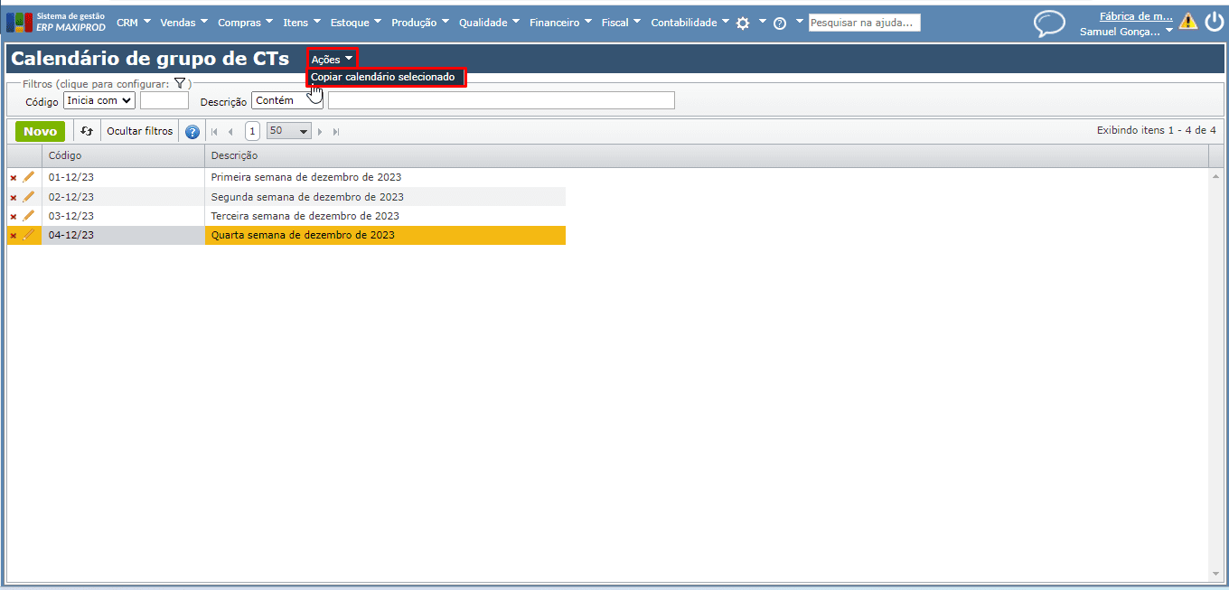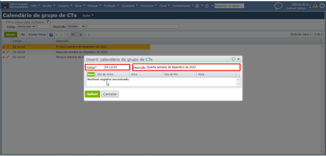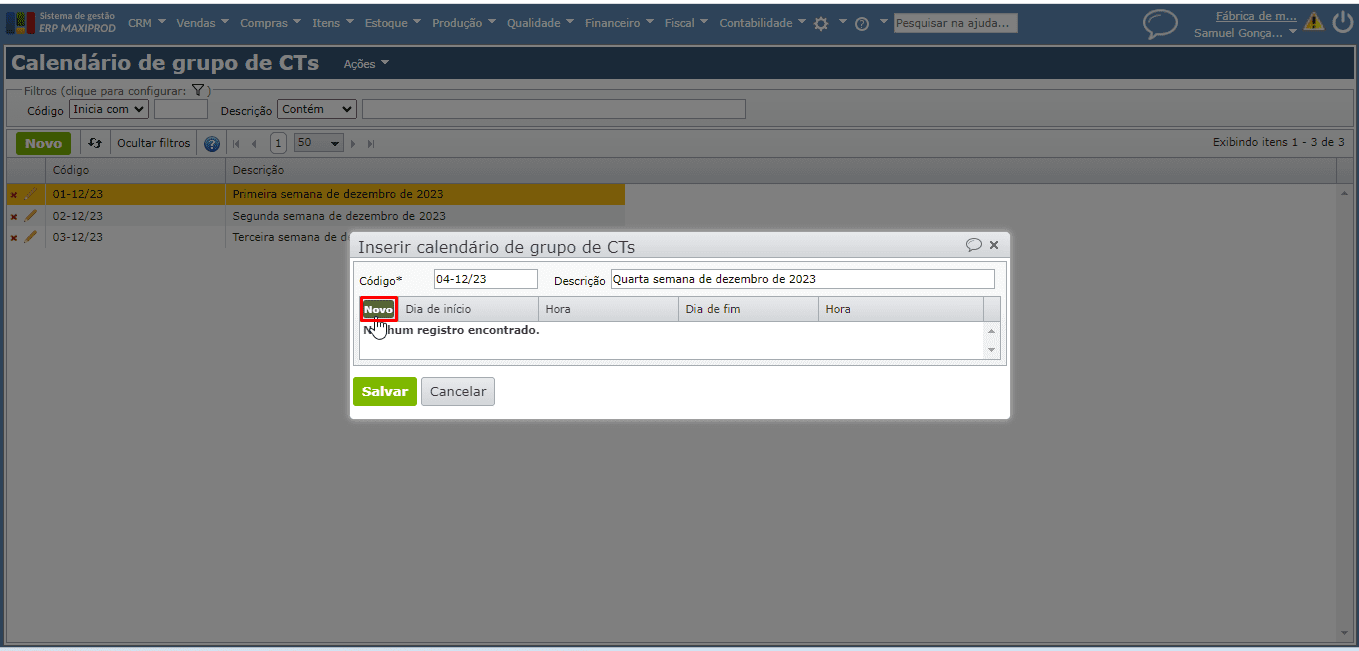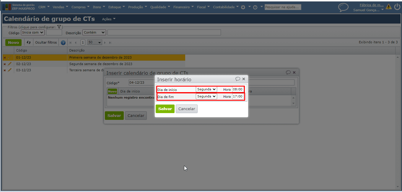 - Como cadastrar calendário de grupo de centros de trabalho?