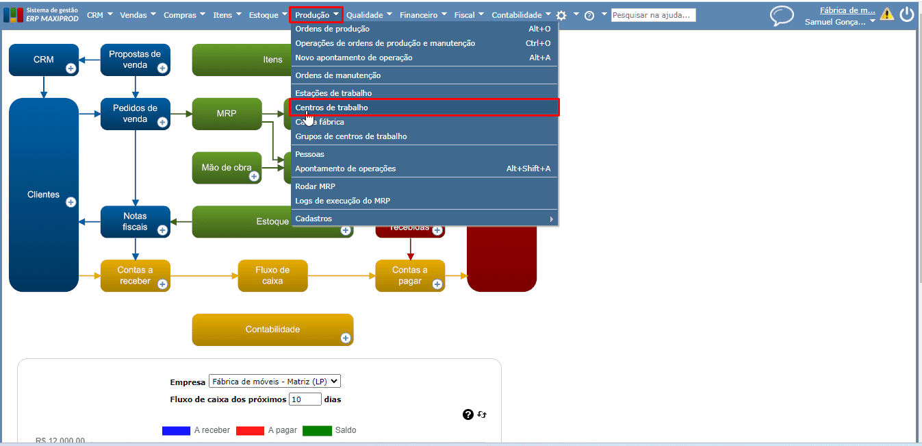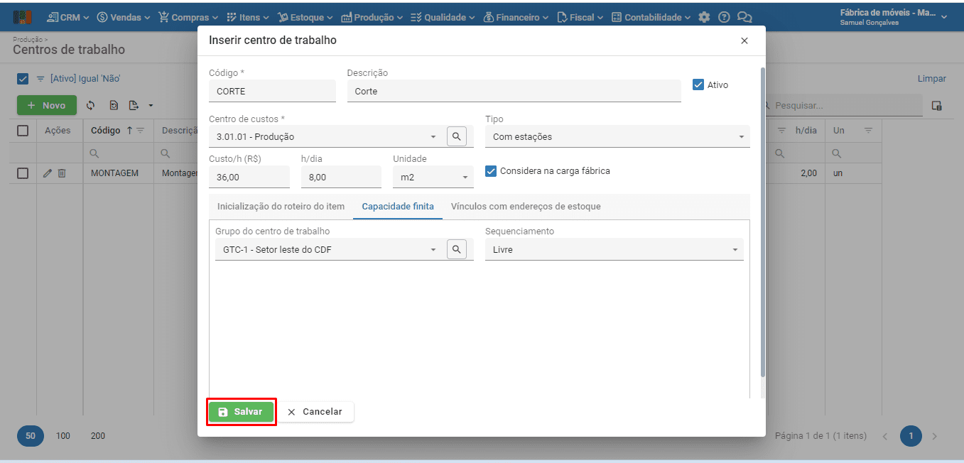 1) Para cadastrar/editar um centro de trabalho, acesse o menu superior “Produção” > opção “Centros de trabalho”.