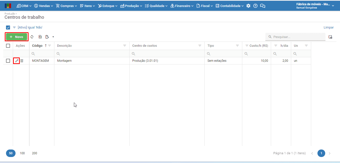 2) Clique no botão verde “Novo” para cadastrar um novo centro de trabalho ou no ícone do lápis de um centro de trabalho já cadastrado para editá-lo.