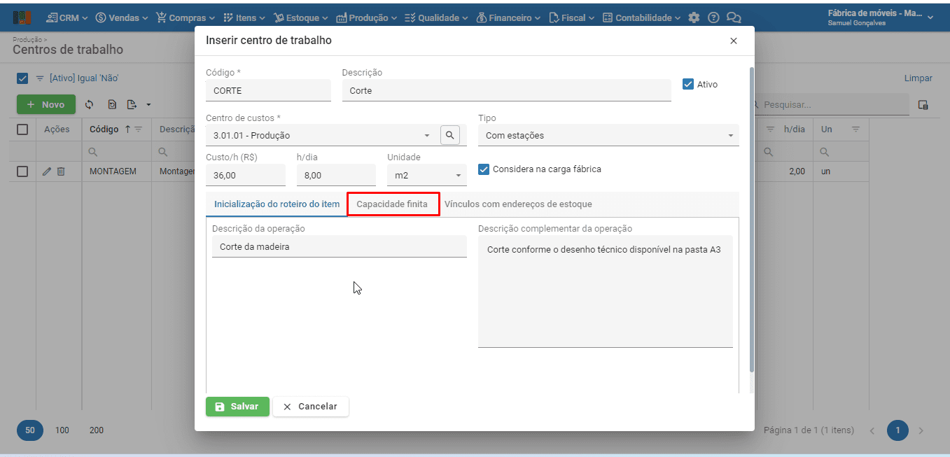 3) Na janela de inserção/edição do centro de trabalho, clique na seção “Capacidade finita”.