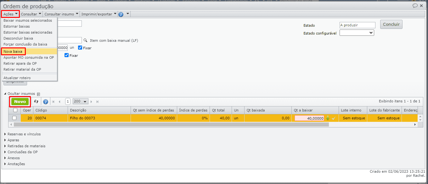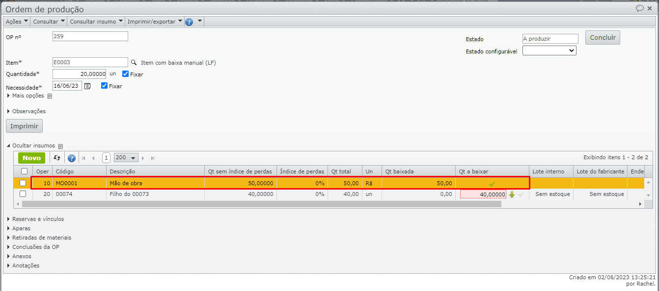 - Note que a mão de obra ficará destacada como um dos itens baixados para a OP: