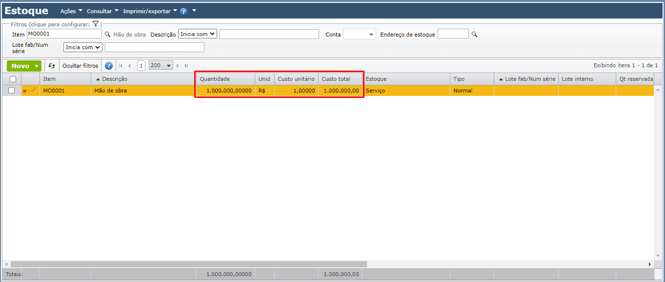 - A seguir, faça uma entrada manual no estoque de uma quantidade elevada desse item de “Mão de obra”, no valor unitário de R$1,00. Desta forma, sempre será possível como baixar o item “Mão de obra”, sendo baixada uma unidade para cada R$ de custo de mão de obra.
