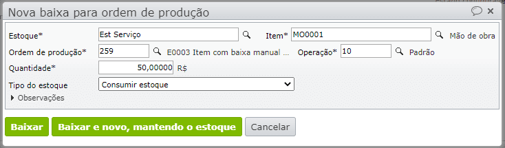 - Selecione o item de mão de obra e o estoque desse item para baixar e informe uma quantidade igual ao custo de mão de obra que deseja inserir nessa OP: