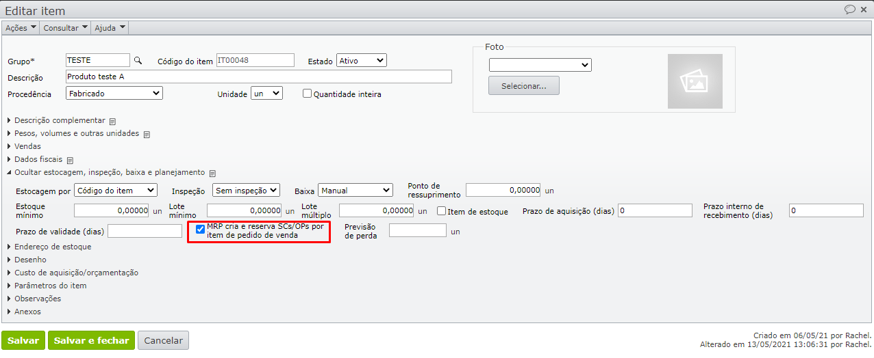 Se, no cadastro do item, a opção “MRP cria e reserva Solicitações de compra/Ordens de Produção por item de pedido de venda” estiver marcada, o MRP irá sugerir Solicitações de compra e Ordens de Produção individuais para atender diferentes pedidos de venda.