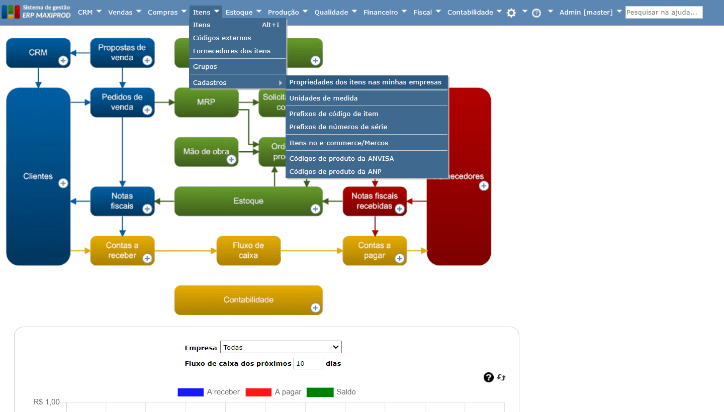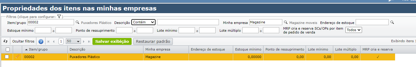 Além de podermos editar no próprio cadastro do item, também podemos visualizar e editar essas propriedades através do menu “Itens > “Cadastros > Propriedades dos itens nas minhas empresas”: