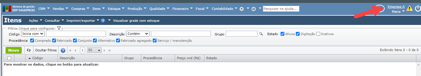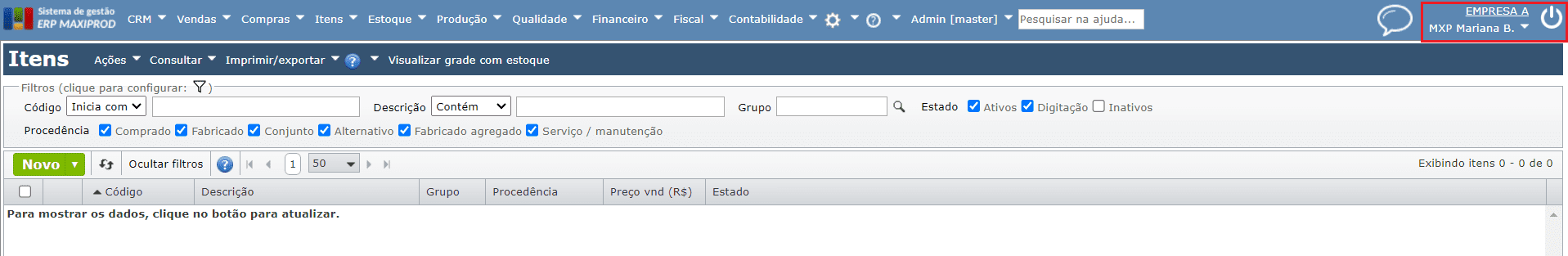 O cadastro de itens e grupos é comum a todos CNPJs de uma assinatura multi-CNPJ. No entanto, para fins de planejamento e controle da produção, algumas propriedades dos itens são próprias de cada CNPJ.