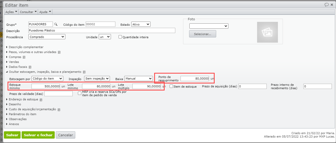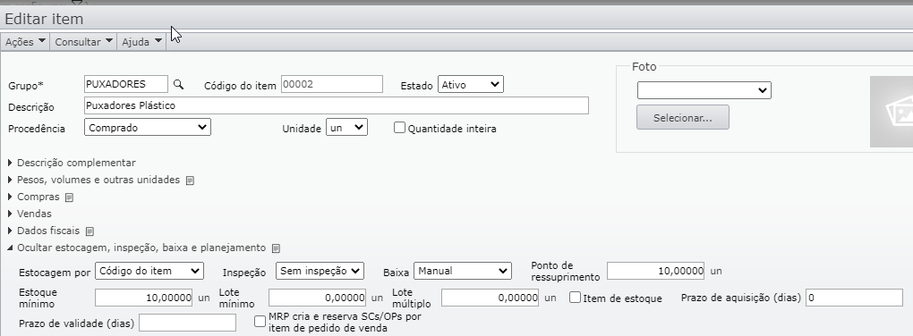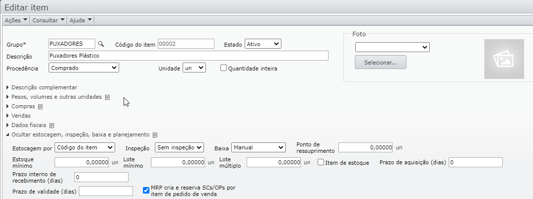 Propriedades dos itens, próprias de cada CNPJ, relevantes para o MRP: