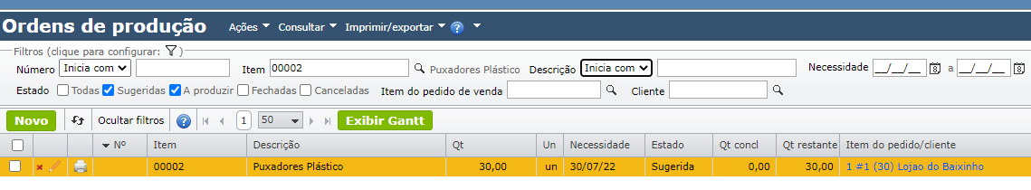2) Na empresa “B”, o MRP sugeriu uma Ordem de produção de 30 unidades, conforme o Pedido de venda nº 1:
