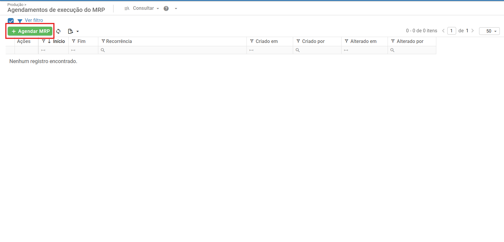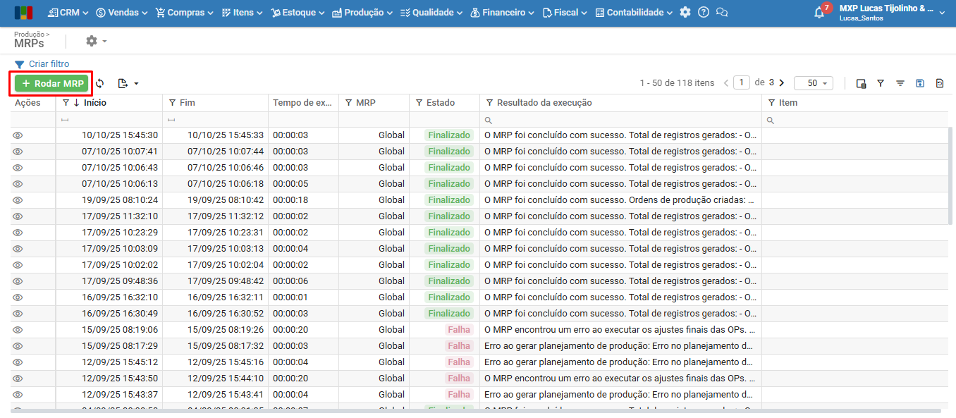 2) Na tela de MRPs, clique no botão verde “Rodar MRP” no canto superior esquerdo.
