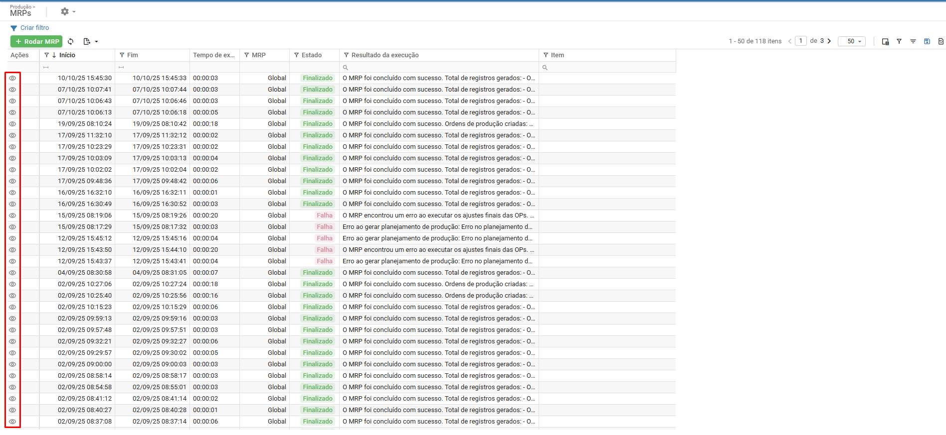 2) A tela exibirá as execuções do MRP, clique no ícone de “olho” para visualizar os detalhes da execução.