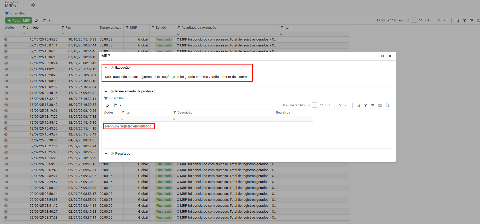 “MRP atual não possui registros de execução, pois foi gerado em uma versão anterior do sistema.”