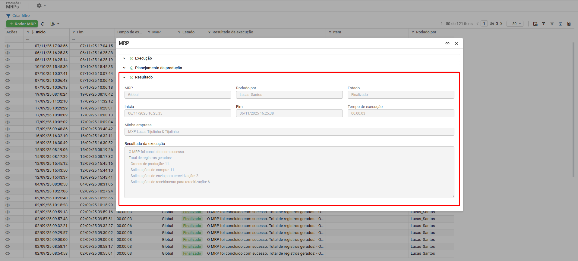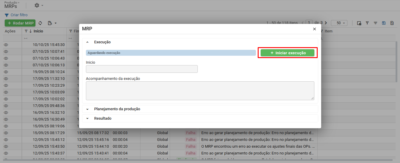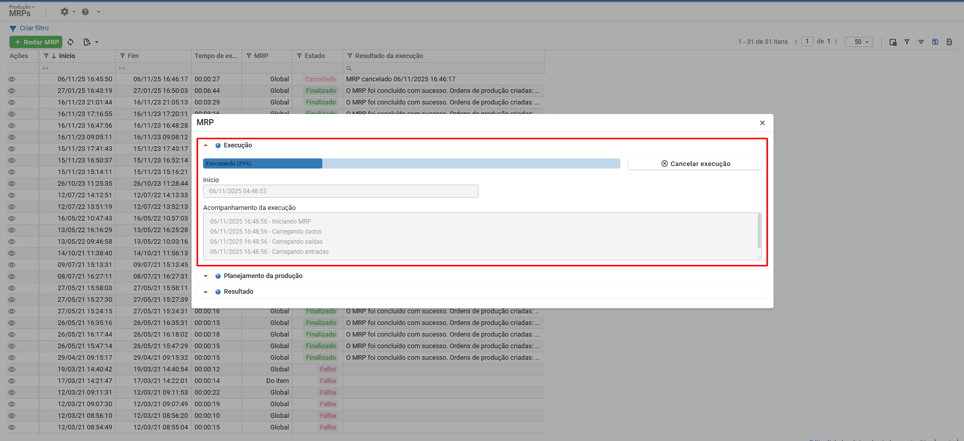 - Executando: neste estado, o MRP está realizando as análises e cálculos para criar o planejamento.