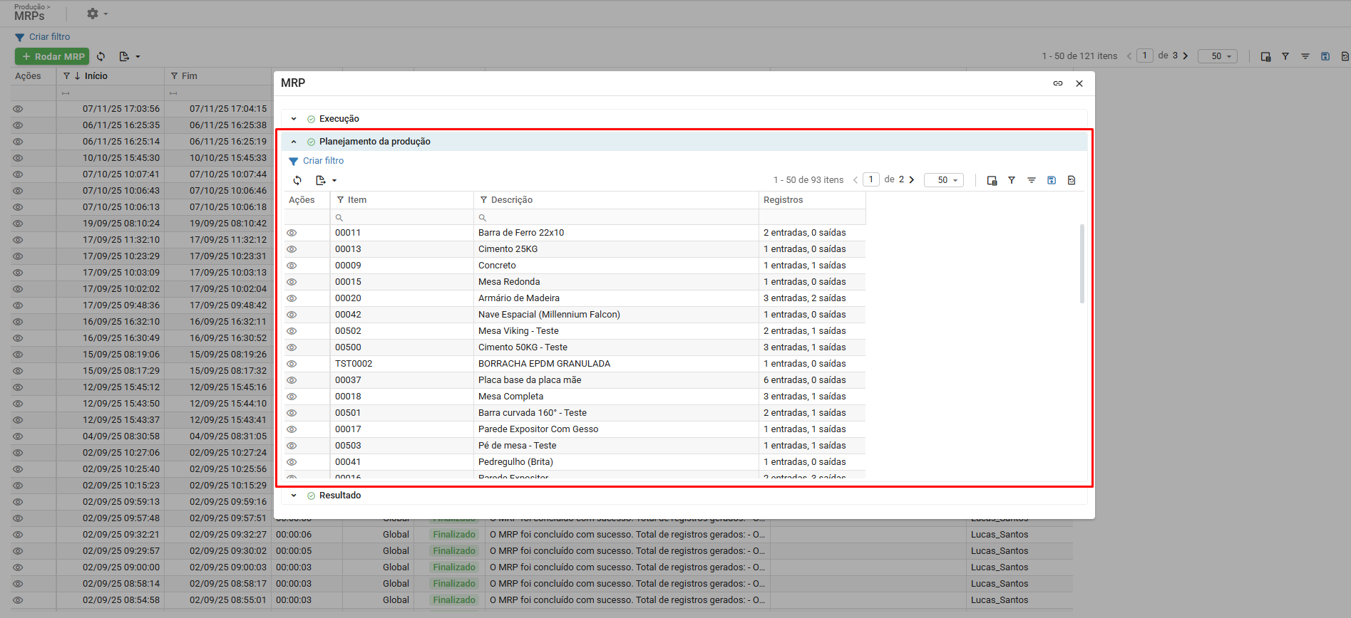 - Planejamento de produção: no planejamento, o MRP indica e exibe todos os registros de entrada e saída por item, justificando as sugestões criadas. Para saber mais, clique aqui.