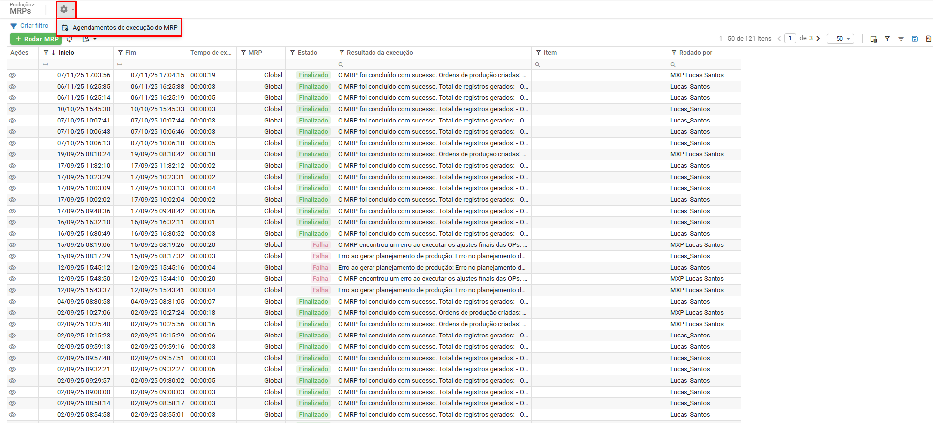 1) Na tela de MRPs, vá até o menu “Roda dentada > Agendamentos de execução do MRP”.