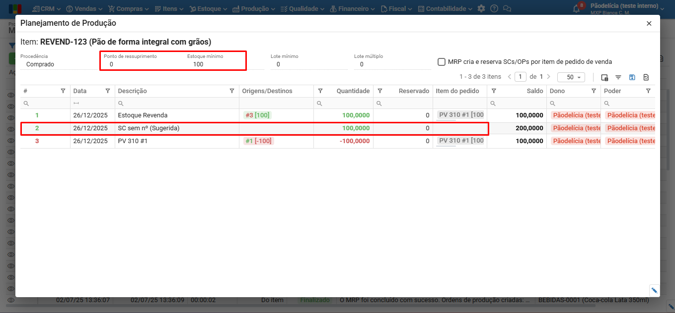 Exemplo: há 100 unidades do item comprado “REVEND-123”, cujo ponto de ressuprimento é 0 e estoque mínimo é 100 unidades, também há um PV de 100 unidades. Ao rodar o MRP, uma SC de 100 unidades será sugerida.