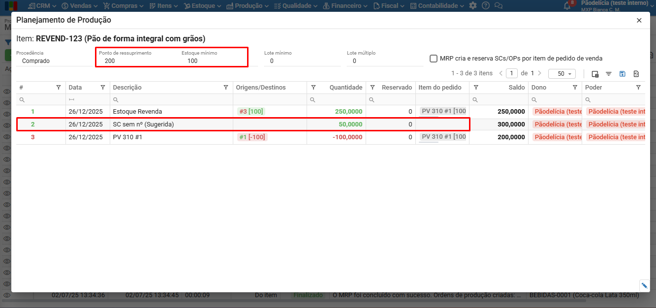 • Planejamento de produção: no planejamento, o MRP indica e exibe todos os registros de entrada e saída por item, justificando as sugestões criadas. Para saber mais, clique aqui.