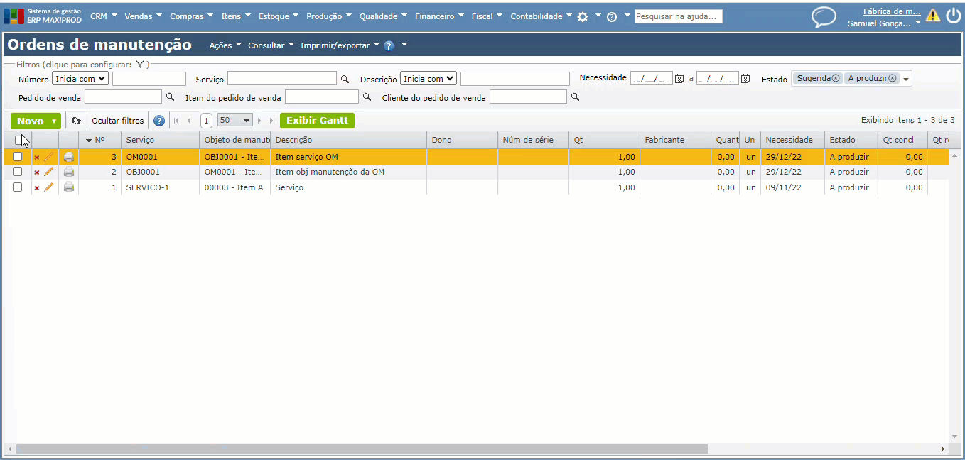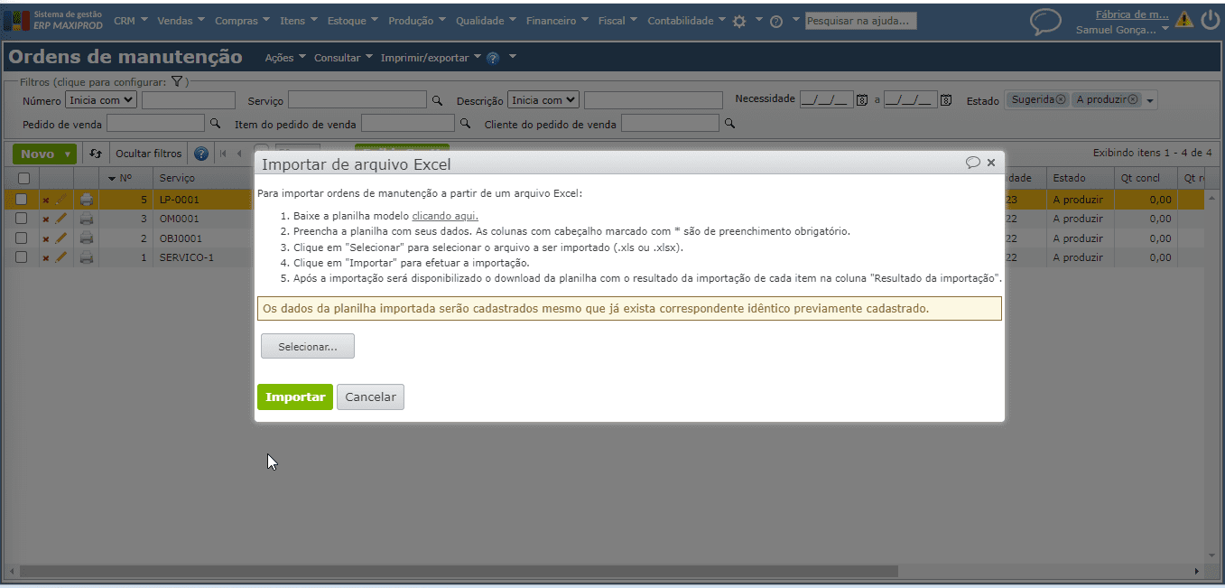 O vídeo (YouTube) abaixo mostra a emissão de ordens de manutenção no ERP MAXIPROD:
