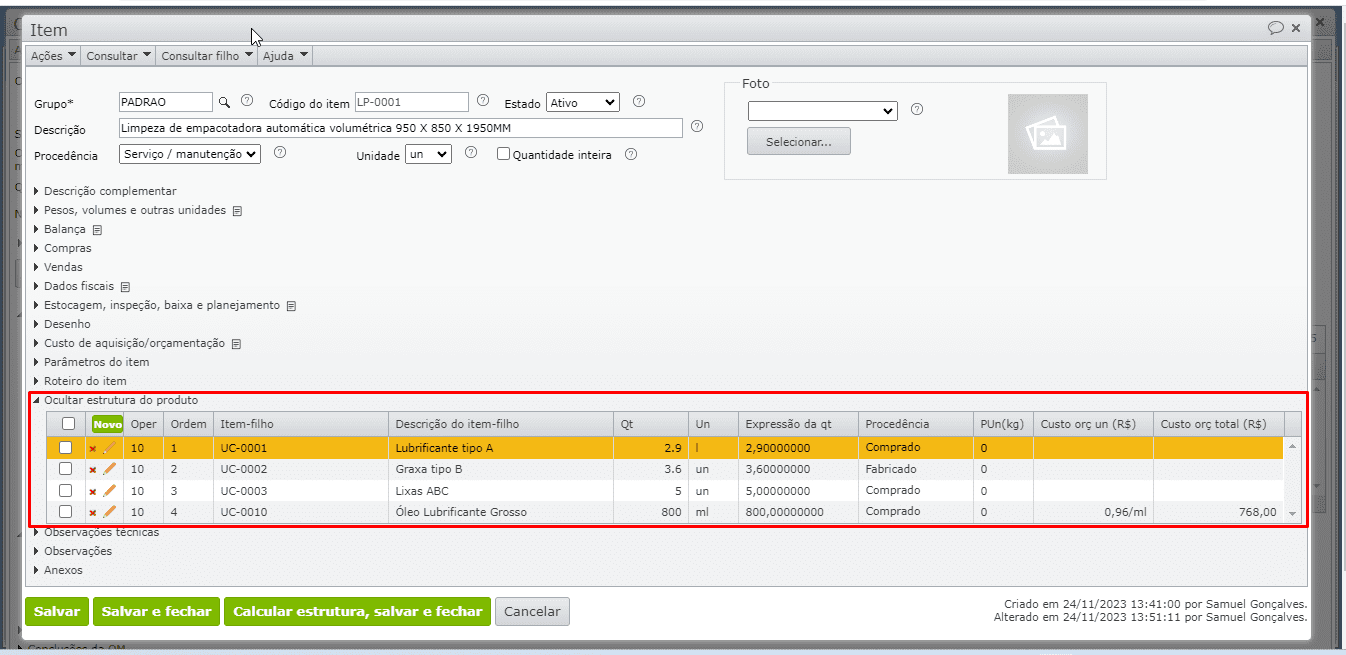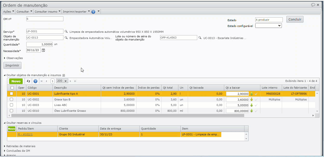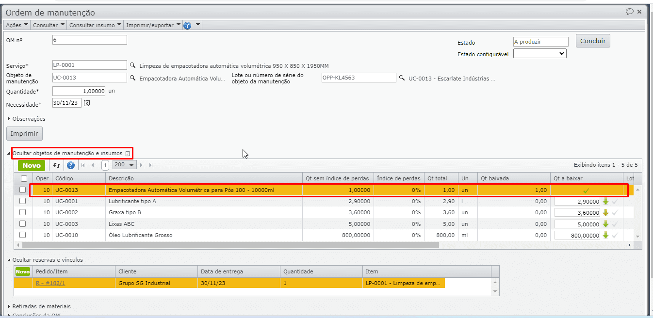1) Os insumos da OM são inicializados pela estrutura de produto do item “serviço de manutenção”. Portanto, no cadastro do item serviço, o usuário pode informar como itens-filho os insumos que serão usados na manutenção.