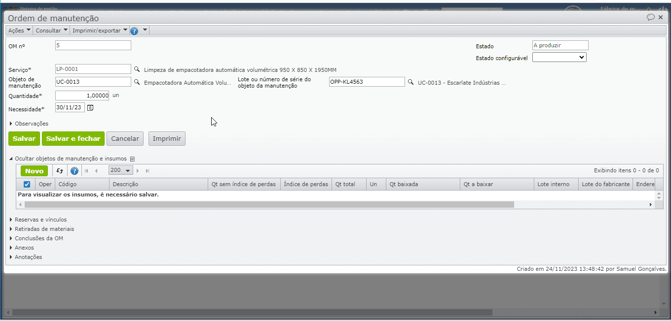 3) Informe o item serviço, o objeto de manutenção e a sua quantidade. Se o objeto de manutenção tem um número de série ou de lote, informe-o no campo “Lote ou número de série do objeto da manutenção”. Preencha os demais campos e clique no botão verde “Salvar” ou em “Salvar e fechar” para efetivar a criação da OM.
