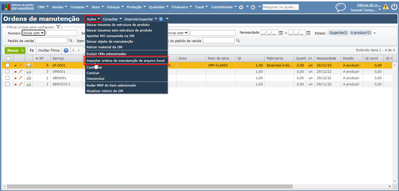 2) A seguir, clique no submenu “Ações > Importar ordens de manutenção de arquivo Excel”.