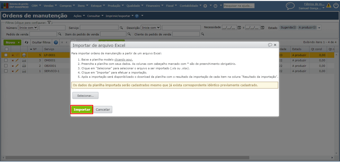 4) Selecione a planilha com os dados preenchidos e importe-a, clicando no botão verde “Importar”.