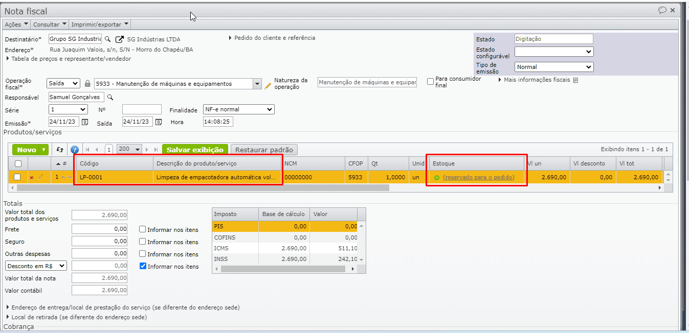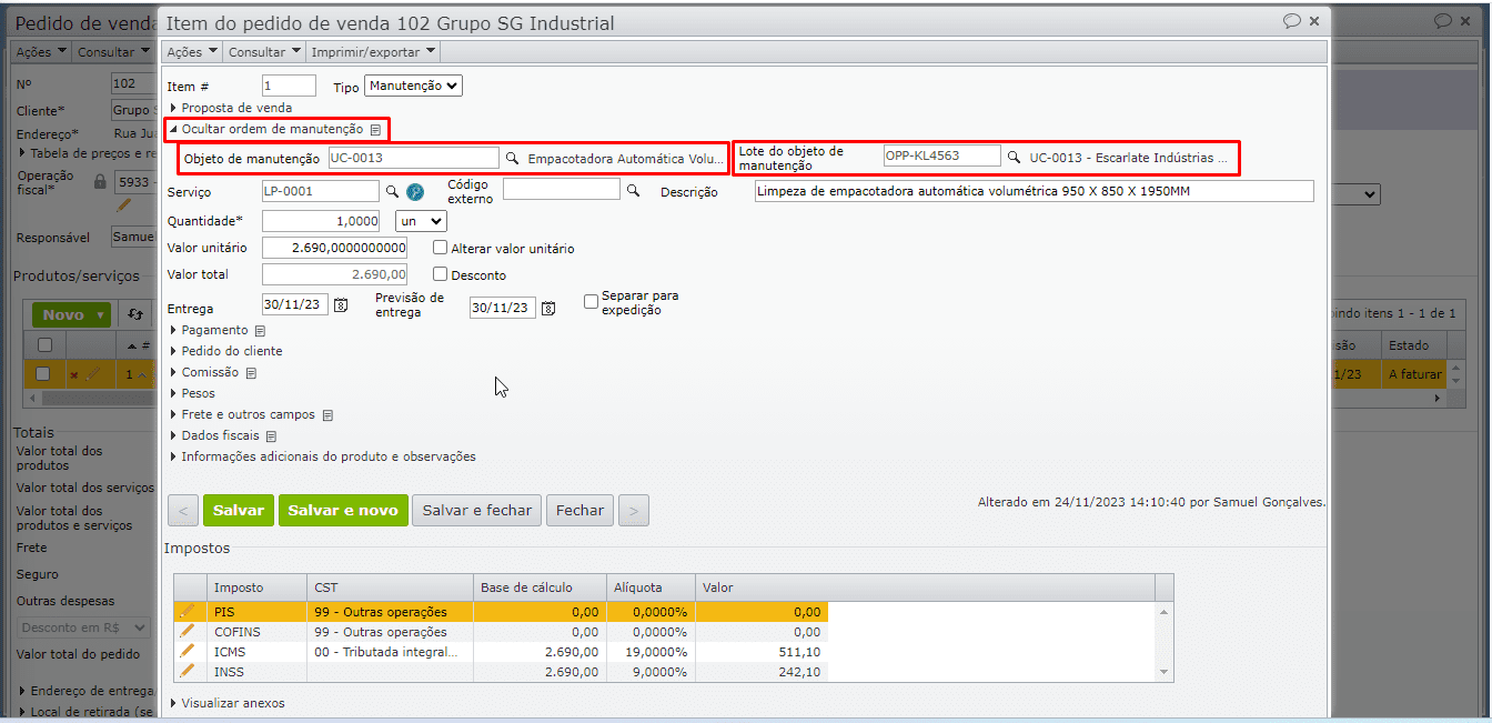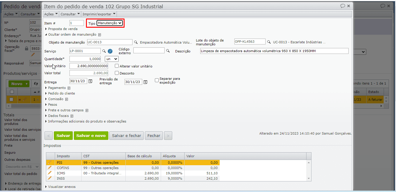2) Após preencher os campos necessários, como cliente, operação fiscal, etc., insira o item de manutenção, cujo tipo deve ser “Manutenção”.