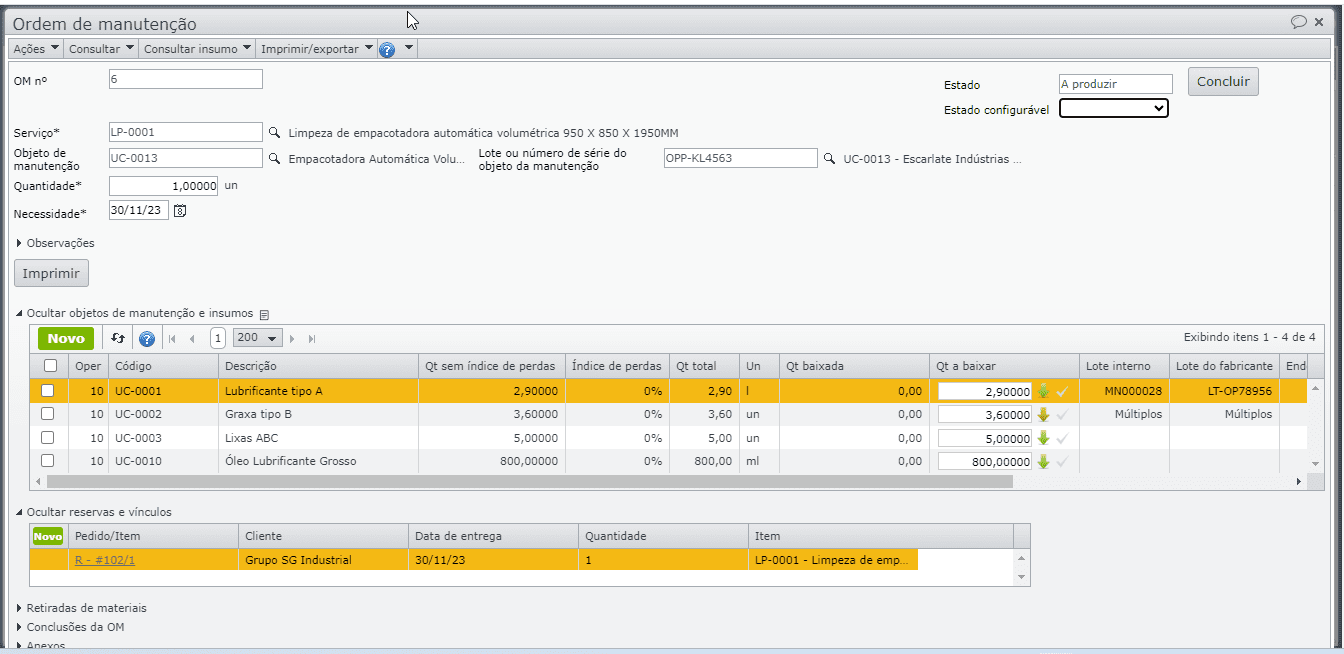 Uma OM é um caso particular de OP, cujo produto e principal insumo são o mesmo item, chamado “objeto de manutenção”. A OM pode ser criada manualmente, por importação, ou ao emitir um pedido de venda (PV) que tem um item do tipo “manutenção”. OMs não são criadas pelo MRP.